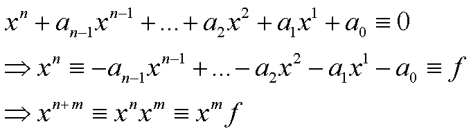 multiplication 'modulo p(x)' thus. any power of x higher than n-1 is