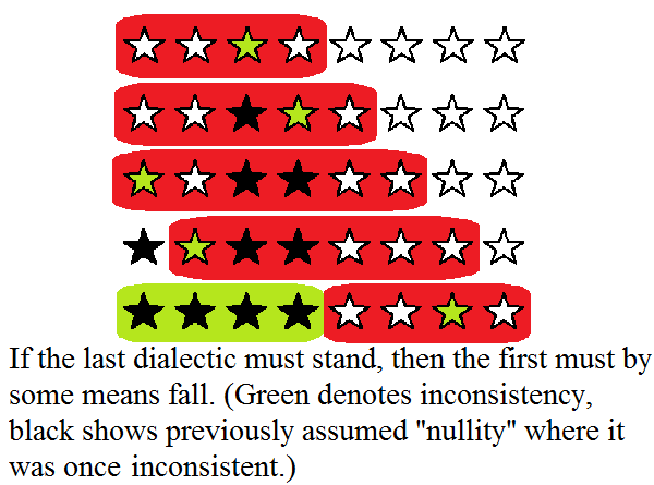 Then the dialectic itself is shown to be inconsistent as a method, if it may only be applied in one sequence of seven, never eight. The accumulation of the dialectic shows its method inconsistent as a form of logic. (Unity can not be sent to the empty set, and absolute truth is unaffected by a lie, you can't lie God out of existence.)