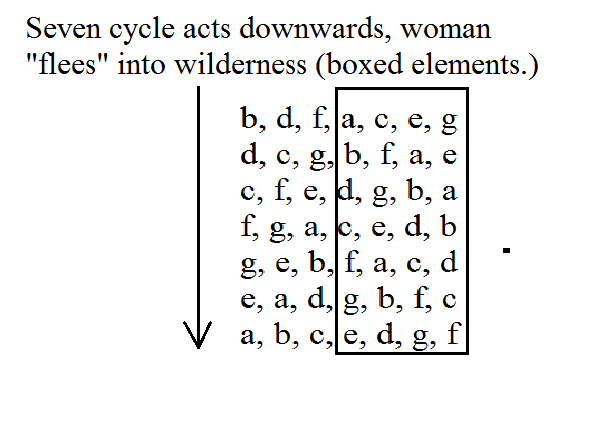 Under the action of the seven cycle we se the woman flies into the wilderness - the place prepared in the earthy elements corresponding to the alternatives for the static subgroup.