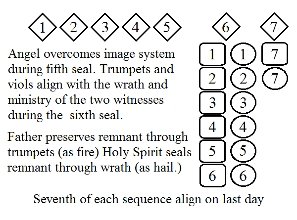 The seventh of each (our pair) of the seals and trumpets align also to the completion of the angel's work of drawing out the whole flock - with all overcoming Philadelphia (and the whiole elect meeting every condition to overcome laodicea. The days are cut short - Jesus indeed comes quickly.) Then the viols are generated as necessary for the resurrection and the seven vials are filled by the action of the Holy Spirit in a seven cycle. Lastly the same seven cycle finds its rest element after the movement in the sixth seal sequence - the time-line has moved from completion of the seventh seal to the start of the sixth seal.