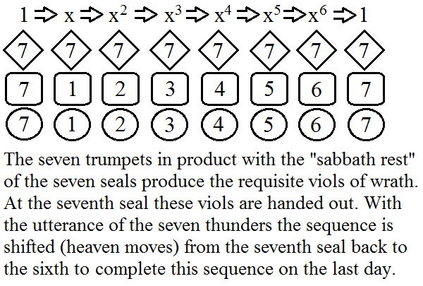 I hope the diagram is self explanatory. However the completion of each sequence of seals trumpets and viols is with the resurrection on the last day. We know when every seal is loosed that the resurrection will surely happen: it is the end of sequence in the prophecy. However the rest element of each cycle (of seven) both precedes and follows the cycle and is the "background" to the setting of each cycle as if the seventh were an identity element. The question remains, that during the days of the seventh trump as the angel swears there should be time no longer then the seven thunders are uttered - (which represent a movement in heaven as opposed to an earthquake which is a movement of the four earthy elements.) what movement is there?